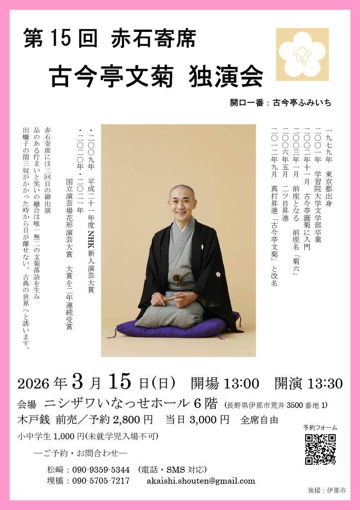 『第15回 赤石寄席』の詳細が決定しました。今回は赤石寄席3回目の御出演となります古今亭文菊師匠の独演会です!